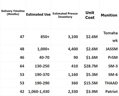 The data shows a rapid and unprecedented depletion of several vital missile systems. For example, between 1,060 and 1,430 “Patriot” missiles have been consumed, representing a significant portion of the original stockpile of 2,330 missiles.