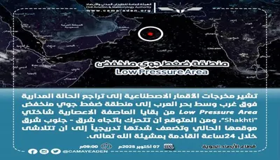 أفاد مركز التنبؤات الجوية والإنذار المبكر التابع للهيئة العامة للطيران المدني والأرصاد، بالعاصمة عدن، بتراجع الحالة المدارية فوق غرب وسط بحر العرب إلى منطقة ضغط جوي منخفض Low Pressure Area من بقايا العاصفة الاعصارية شاختي Shakhti”، بحسب ما أشارت إليه مخرجات الأقمار الاصطناعية.