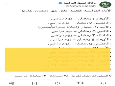 في قرار يُعيد تشكيل خريطة التعليم في الشرق الأوسط، أعلنت وزارة التعليم السعودية تطبيق خطة ثورية تقلص أيام الدراسة في رمضان 1447 إلى 11 يومًا فقط من أصل 30 يومًا، في تخفيض مذهل بنسبة 63%. هذا القرار التاريخي يمنح الطلاب إجازة عيد فطر استثنائية تمتد لـ22 يومًا متواصلة - الأطول في تاريخ المملكة. الخبراء يؤكدون: هذا النموذج قد يصبح مرجعًا عالميًا للتعليم المتوازن.