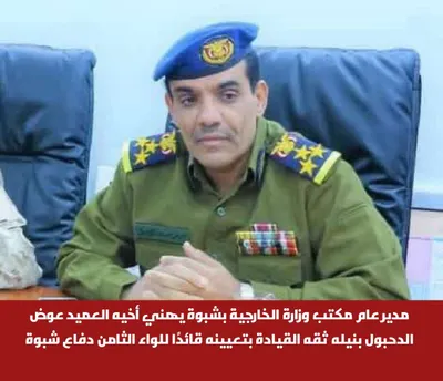 مدير عام مكتب وزارة الخارجية بشبوة يهني أخيه العميد عوض الدحبول بنيله ثقه القيادة بتعيينه قائدا للواء الثامن دفاع شبوة