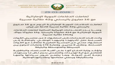 تعاملت الدفاعات الجوية الإماراتية (29 مارس 2026) مع 16 صاروخ باليستي و 42 طائرة مسيرة قادمة من إيران.