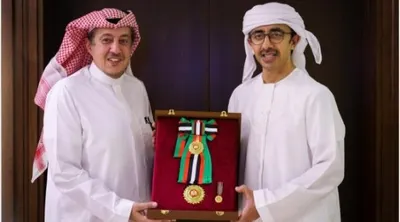 وقلَّد الشيخ عبدالله بن زايد آل نهيان، وزير الخارجية، السفير السعودي الوسام خلال استقباله له اليوم في أبوظبي.