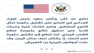 قالت السفارة الأمريكية لدى اليمن إنها جهود رئيس مجلس الوزراء شائع الزنداني في التركيز على تشكيل الحكومة الجديدة.