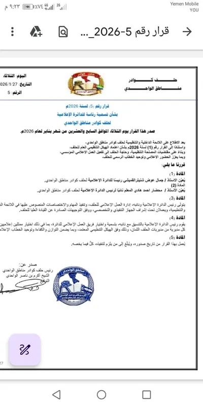 اعلام – الحلف 27-1-2026 أصدر رئيس حلف كوادر مناطق الواحدي الشيخ اكرم بن ناصر الواحدي قرارا قم (5) لسنة 2026 ينص على تعين رئيساً لهيئة الإعلام بالحلف ونائباً له وقد جاء في القرار مالي : بشأن تسمية رئاسة للدائرة الإعلامية لحلف كوادر مناطق الواحدي وبعد الاطلاع على اللائحة الداخلية والتنظيمية لحلف كوادر مناطق الواحدي صدر هذا القرار اليوم الثلاثاء الموافق السابع والعشرين من شهر يناير لعام 2026م. وبما يعزز الحضور الإعلامي وتوحيد الخطاب الرسمي للحلف واستنادا إلى القرار رقم (1) لسنة 2026م بشأن اعتماد الهيكل التنظيمي العام للحلف وبناء على مقتضيات المصلحة التنظيمية، وحاجة الحلف إلى تفعيل العمل الإعلامي المؤسسي قررنا ما يلي: المادة (1) يعين الاستاذ جمال عوض شنيتر القميشي رئيسا للدائرة الإعلامية لحلف كوادر مناطق الواحدي المادة (2) يعين الأستاذ / محضار احمد هادي المعلم نائباً لرئيس الدائرة الإعلامية لحلف كوادر مناطق الواحدي المادة (3) يتولى رئيس الدائرة الإعلامية ونائبه، إدارة العمل الإعلامي للحلف، وتنفيذ المهام والاختصاصات المنصوص عليها في اللائحة التنظيمية، ويعملان تحت إشراف الجهاز التنفيذي والتخصصي، ووفق التوجيهات الصادرة عن القيادة العليا للحلف. المادة (4) يقوم رئيس الدائرة الإعلامية بالتنسيق مع نائبه بتسمية واختيار فريق العمل الإعلامي للدائرة، بما في ذلك اختيار ممثلين إعلاميين لكل مديريات الحلف الثمان، وذلك وفق الهيكل التنظيمي المعتمد، وبما يضمن التوازن والكفاءة وتوحيد الخطاب الإعلام المادة (5) يعمل بهذا القرار من تاريخ صدوره، ويبلغ إلى من يلزم لتنفيذه، كل فيما يخصه. صدر عن رئيس حلف كوادر مناطق الواحدي الشيخ أكرم بن ناصر الواحدي