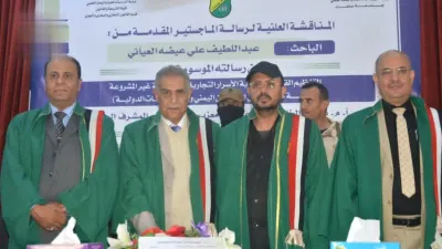 وقد تكونت لجنة المناقشة والحكم من رئيس قسم القانون التجاري بكلية الشريعة والقانون بجامعة صنعاء الأستاذ الدكتور عبدالرحمن شمسان رئيساً، وعضوية كل من أستاذ القانون التجاري بكلية الشريعة والقانون بجامعة صنعاء الأستاذ الدكتور عبدالخالق معزب، وأستاذ القانون بأكاديمية الشرطة الأستاذ الدكتور فهد الخياط.