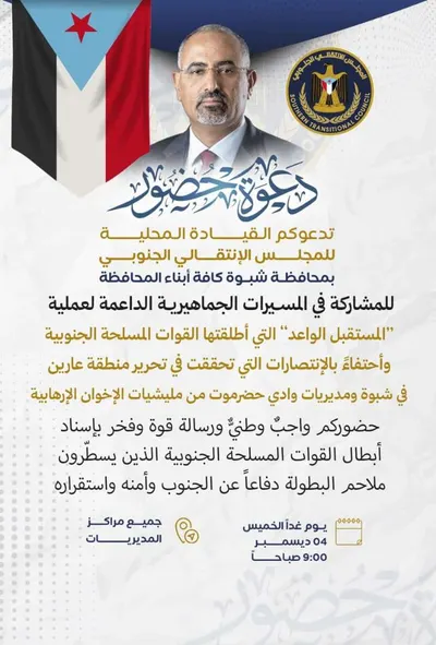 انتقالي شبوة يدعو أبناء المحافظة للمشاركة في مسيرات جماهيرية دعما لعملية المستقبل الواعد والاحتفاء بانتصارات القوات الجنوبية