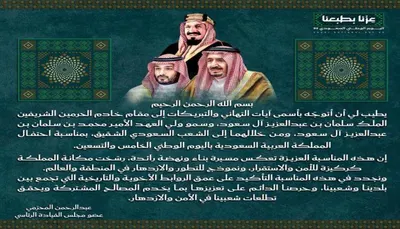 إن هذه المناسبة العزيزة تعكس مسيرة بناء ونهضة رائدة، رسّخت مكانة المملكة كركيزة للأمن والاستقرار، ونموذج للتطور والازدهار في المنطقة والعالم.