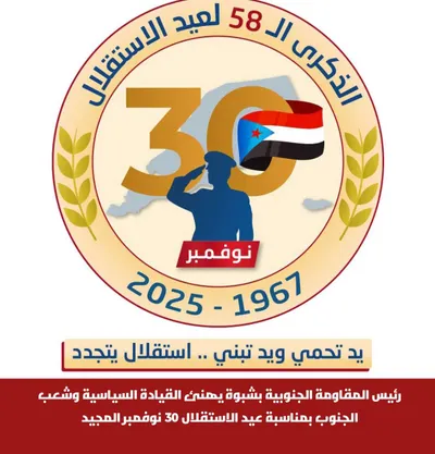 رئيس المقاومة الجنوبية بشبوة يهنئ القيادة السياسية وشعب الجنوب بمناسبة عيد الاستقلال 30 نوفمبر المجيد