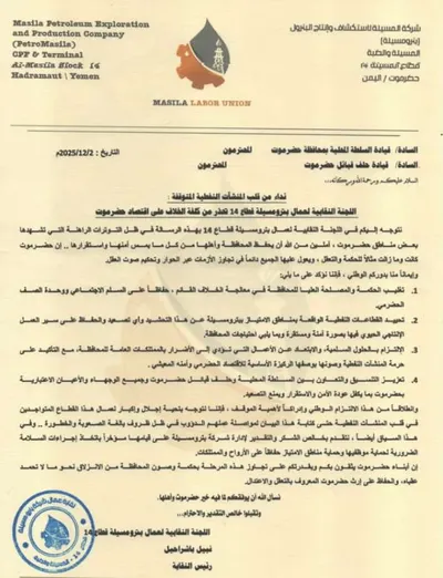 نداء من قلب المنشآت النفطيةالمتوقفة :اللجنة النقابية لعمال بترومسيلة قطاع 14 تحذر من كلفة الخلاف على اقتصاد حضرموت.