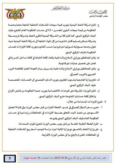 بالوثائق مجلس القيادة الرئاسي يطلق خطة إصلاح اقتصادي شاملة تركز على ضبط إيرادات المحافظات