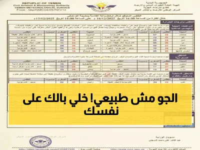 في تطور صادم يهز اليمن من أقصاه إلى أقصاه، أعلن المركز الوطني للأرصاد الجوية تحذيراً عاجلاً من موجة برد قطبية ستضرب 16 محافظة يمنية خلال الـ24 ساعة القادمة، مهددة ملايين المواطنين بأقسى أجواء شتوية منذ سنوات. لأول مرة منذ فترة طويلة، تتحول الرياح إلى قوة جبارة بسرعة 25 عقدة، محولة البحر اليمني الهادئ إلى وحش هائج يبتلع كل من يجرؤ على تحديه.