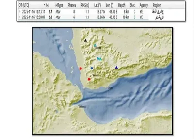 وذكر أنه تم تسجيل هزة أرضية خفيفة بقوة 2.6 درجة الساعة 6.38 مساء في منطقة التربة وأخرى خفيفه بقوة 2.7 درجة الساعة 7.13 مساء جنوب شرقي المخا في محافظة تعز.
