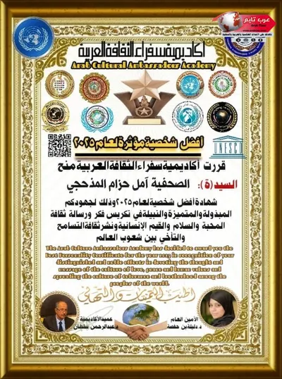 يتقدم الناشط الحقوقي أسعد أبو الخطاب – نائب رئيس صحيفتي “عدن الأمل” و”عرب تايم” – بأصدق التهاني والتبريكات إلى الأستاذة الفاضلة الصحفية القديرة أمل حزام المذحجي، رئيسة تحرير صحيفة عدن الأمل الإخبارية، بمناسبة اختيارها من قبل الأكاديمية الثقافية العربية برئاسة الدكتور عبدالرحمن سلطان، ومنحها شهادة “أفضل شخصية لعام 2025م”، وتعيينها سفيرة للأكاديمية الثقافية العربية.