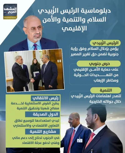 دبلوماسية الرئيس الزبيدي السلام والتنمية والأمن الإقليمي إنفوجراف