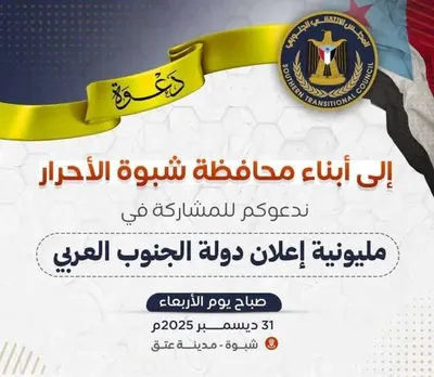 دعوة هامة وعاجلة لاحرار شبوة ومناضليها وشرفائها للمشاركة والاحتشاد في مليونية يوم الأربعاء، في عاصمة المحافظة عتق، وذلك دعما لانتصارات قواتنا المسلحة الجنوبية الباسلة، وتأييدا لقرارات المجلس الانتقالي نحو استعادة وبناء الدولة الجنوبية.