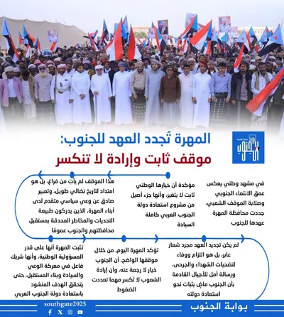 أكد الشيخ راجح سعيد باكريت عضو هيئة رئاسة المجلس الانتقالي الجنوبي، أن محافظة المهرة في مليونية النصر والقرار قرارنا حسمت موقفها وأرسلت رسالة واضحة بأن القرار هو قرارنا والشرعية هي شرعية الشعب الجنوبي. جاء ذلك خلال تدوينه له على منصة (أكس) العالمية. وأشار الشيخ راجح باكريت بأن محافظة المهرة البوابة الشرقية للجنوب العربي تعلو فيها الرايات وتحسم المواقف وتصل الرسالة واضحة للقاصي والداني: لا حياد في معركة الوجود، والقرار قرارنا. وأكد الشيخ راجح باكريت أن المهرة فوضت الرئيس القائد عيدروس بن قاسم الزُبيدي، بإعلان دولة الجنوب العربي, ولن تساوم على الحقوق مهما كانت التحديات.