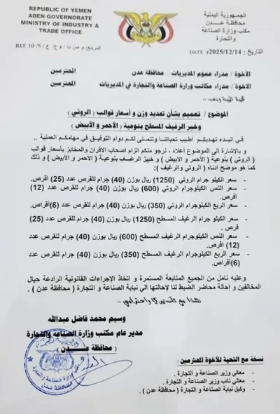 أصدر مدير عام مكتب الصناعة والتجارة بالعاصمة عدن، العميد وسيم محمد فاضل العُمري، تعميماً صارماً يقضي بتحديد سعر ووزن مادة الروتي في كافة الأفران والمخابز، مع دخول القرار حيز التنفيذ الإلزامي ابتداءً من صباح يوم الاثنين، في خطوة حاسمة تهدف إلى كبح جماح التلاعب بقوت المواطنين.