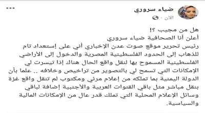 أعلنت الصحافية ضياء سروري رئيس تحرير موقع صوت عدن الإخباري أنها على استعداد تام للذهاب إلى الحدود الفلسطينية المصرية والدخول إلى الأراضي الفلسطينية المسموح بها لنقل وقائع الحال هناك إذا تيسرت لها الإمكانات التي تسمح لها عملية التصوير من تراخيص وخلافة.وارجعت الصحافية سروري السبب إلى استعدادها الذهاب إلى غزة لتغطية وقائع الحرب وما يتعرض له شعبه وأطفاله ونساءه إلى إبادة جماعية لم تنقل في وسائل اعلام الدولة اليمنية كما يجب.