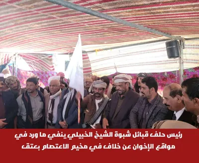 رئيس حلف قبائل شبوة الشيخ الخبيلي ينفي ما ورد في مواقع الإخوان عن خلاف في مخيم الاعتصام بعتق