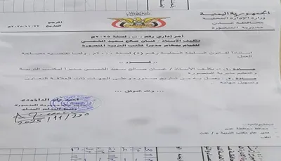 وقضي الأمر الإداري - في مادته الأولى - الذي حمل رقم ( 50 ) لعام 2025م، إستناداً لقانون السلطة المحلية رقم ( 4 ) لسنة 2000م، لما تقتضيه مصلحة العمل، بتكليف الأخ غسان صالح سعيد الشمسي، مديراً لمكتب التربية والتعليم في مديرية المنصورة.