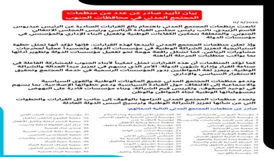 وتدعو منظمات المجتمع المدني جميع المكونات الوطنية والقوى السياسية والاجتماعية إلى الالتفاف حول القيادة السياسية ودعم خطواتها الإصلاحية، بما يسهم في توحيد الصفوف، وتكريس قيم الشراكة، وبناء مؤسسات قادرة على النهوض بمسؤولياتها الوطنية تجاه المواطن والوطن.
