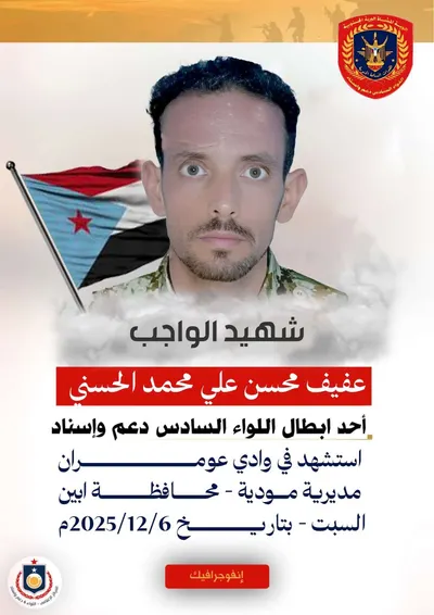 تصدّت قواتنا المسلحة الجنوبية، مساء اليوم، لهجوم إرهابي استهدف مواقع قواتنا في وادي عومران بمديرية مودية في محافظة أبين.