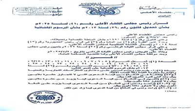 لقد صدر القرار رقم (41) لسنة 2025م عن رئيس مجلس القضاء الأعلى، بشأن تعديل القانون رقم (26) لسنة 2013م الخاص بالرسوم القضائية، استنادًا إلى تفويضٍ قيل إنه صادرٌ من رئيس مجلس القيادة الرئاسي.