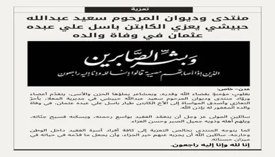 بقلوبٍ مؤمنةٍ بقضاء الله وقدره، وبمشاعر يملؤها الحزن والأسى، يتقدّم أعضاء وروّاد منتدى وديوان المرحوم سعيد عبدالله حبيشي في مديرية المعلا، بأحرّ التعازي وأصدق المواساة إلى الأخ الكابتن طيار باسل علي عبده عثمان، في وفاة والده المغفور له بإذن الله.