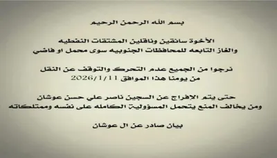 وفقاً للبيان الصادر بتاريخ 11 يناير 2026، وجهت القبائل دعوة صريحة لجميع سائقي وناقلي المشتقات النفطية والغاز المتجهة نحو المحافظات الجنوبية بضرورة التوقف التام عن الحركة، سواء كانت الناقلات محملة أو فارغة.