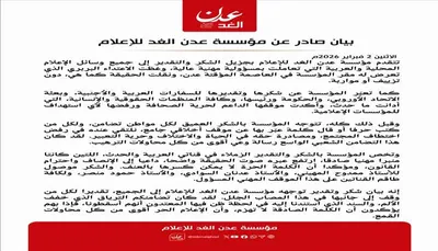 أصدرت مؤسسة عدن الغد للإعلام، الاثنين 2 فبراير 2026م، بيانًا عبّرت فيه عن شكرها وتقديرها الواسع لوسائل الإعلام المحلية والعربية، والسفارات العربية والأجنبية، وبعثة الاتحاد الأوروبي، والحكومة ورئيسها، وكافة المنظمات الحقوقية والإنسانية، على مواقفهم المتضامنة عقب الاعتداء الذي تعرض له مقر المؤسسة في العاصمة المؤقتة عدن.