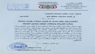 وثيقة وقف صرف او تجديد سجلات تجارية بنشاط محال الصرافة ومحطات الوقود بلحج
