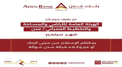 دشن بنك عدن للتمويل الأصغر اليوم الأثنين صرف مرتبات موظفي الهيئة العامة للأراضي والتخطيط العمراني/ عدن.يمكن استلام المرتبات عبر شبكة البنك #عدن_حوالة أو نقاط الصرف التابعة للبنك .